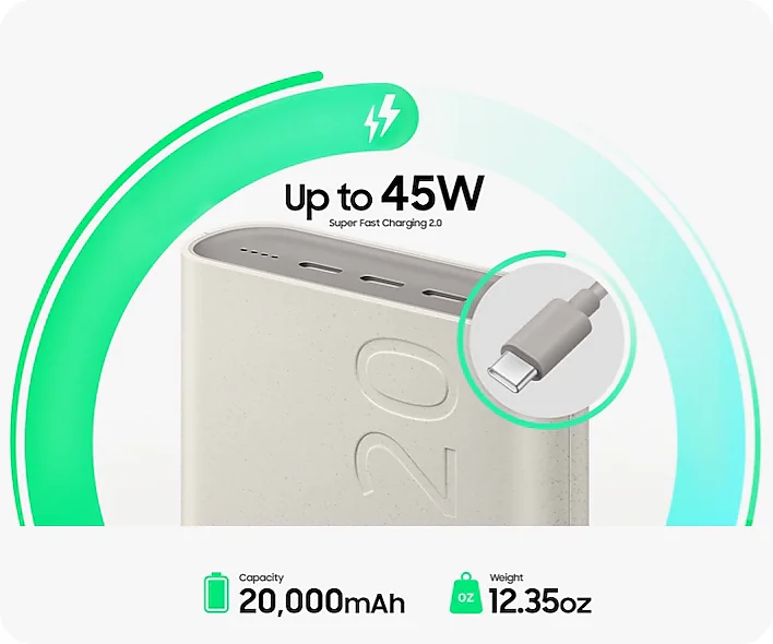 The 45W 20,000mAh Battery Pack with Super Fast Charging 2.0¹ allows you to charge your device in a flash. With a 5A USB C cable included, you have what you need to charge on the go